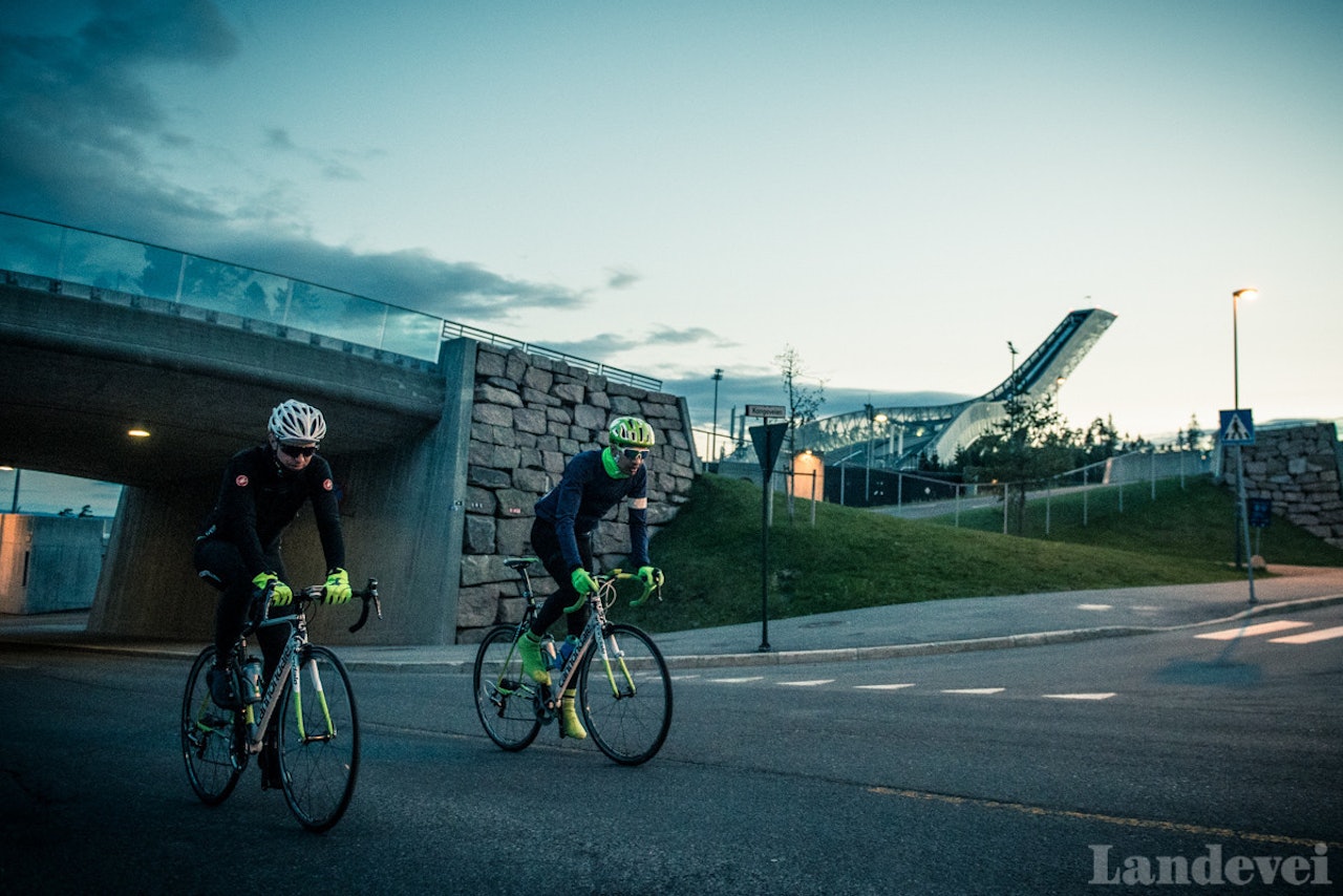 Det er iskaldt å tråkke ut av 7-Eleven igjen. Her har jeg på meg Rapha til en halv formue, men et par varme hansker har jeg ikke vett til å kle på meg. Nå er det tydeligvis avtalt at mange foreldre skal hente russe-kidsa på Tryvann, i alle fall basert på konvoien av familiebiler som raser opp til Tryvann i høy fart. Og det er sikkert de færreste bilister som forventer to syklister på vei til Tryvann midt på natta. Vi velger å sykle på de til dels råtne fortauene av hensyn til egen sikkerhet.