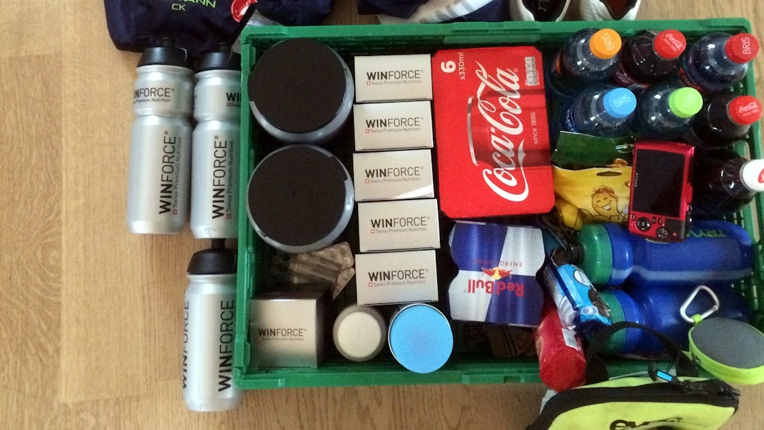 På selve sykkelsetet inntok vi næring i form av hjemmelagde riskaker (Velochef-oppskriften) samt Winforce-produkter. Etter å ha prøvd mye forskjellig sportsernæring er Winforce det som av erfaring har fungert best; høy næringstetthet og magen har aldri protestert. I drikkeflaskene hadde vi da Winforce Carbo Basic Plus, og i lommene hadde vi Ultra Energy Complex-gels og Booster koffeinshots til når Ole Lukkøye melder seg.