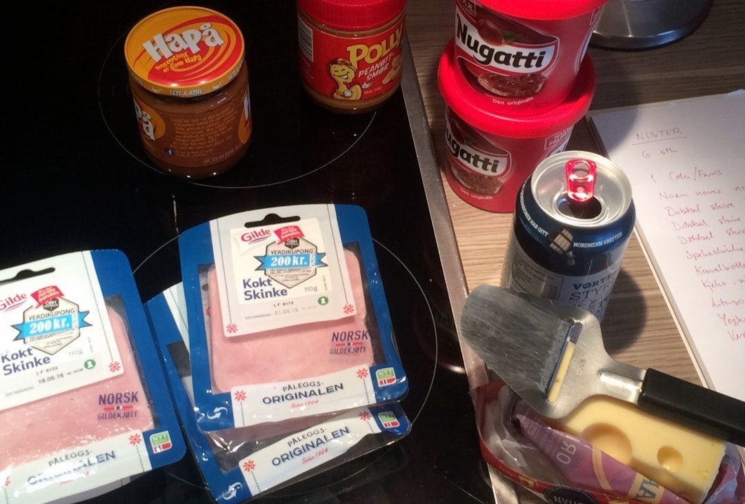 Matpakken for pausene ble formidabel: 36 blingser (skinke/ost, Hapå, Nugatti), to liter Farris, tre liter Coca-Cola, blåbærsaft, fire bokser Red Bull, to liter Litago, 12 pakker Vestlandslefser, diverse kjeks og kanelboller, spekeskinke, to poser nøtteblanding og en pose med Snickers-sjokolade. I tillegg til dette var intensjonen å bestille take-away til middag og eventuelt frokostbuffet på Holmenkollen Hotell søndag morgen. Greit å ha mulighet for variasjon.