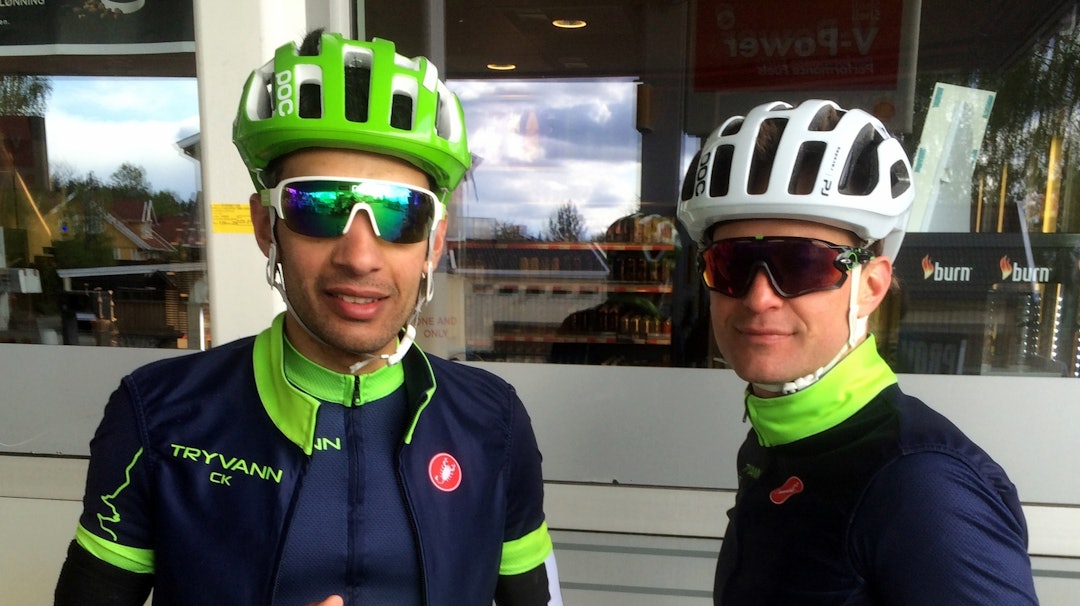 PITSTOP: Etter 14 drag måtte vi stoppe for litt koffeinbasert påfyll. Alexander og jeg var enige om at vi har POCers fine hjelmer.