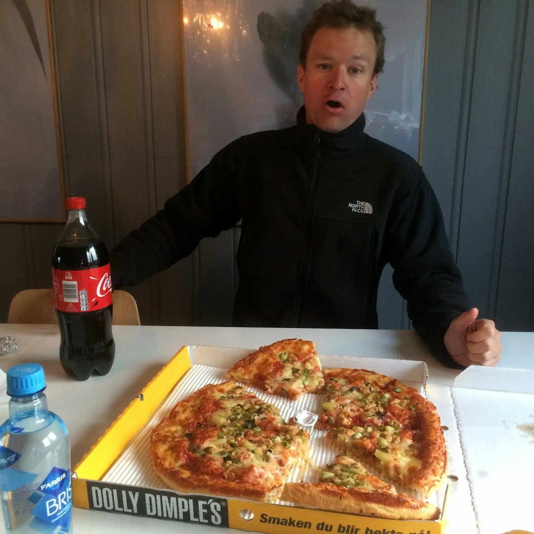 Dolly’s leverer pizzaen 30 minutters forsinkelse, men det gjør lite: Ute regner det kraftig og vi tenker at det er like greit at vi er inne til det klarner; kjipt om klærne tiltenkt natta blir våte og kalde, tross alt. “Sult”-pizzaen smaker sjukt godt.