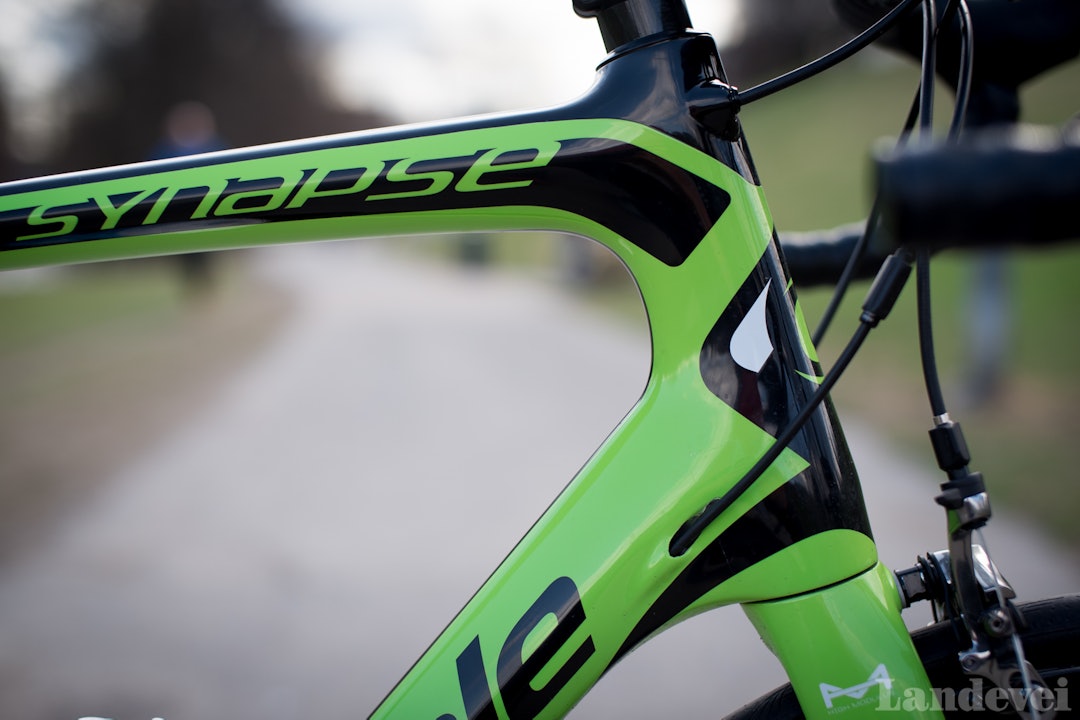 Sykkelen er bygget opp med en komplett SRAM Red-gruppe jeg satte over fra forrige sykkel. Synapse bruker en sjelden 25.4mm diameter på setepinnen, for ekstra komfort. Heldigvis leverer Cannondale rammene sine med setepinne, for det er klin umulig å finne en slik pinne i butikken. Jeg har etter to uker med intensiv googling ennå ikke funnet en fet pinne i den diameteren.
