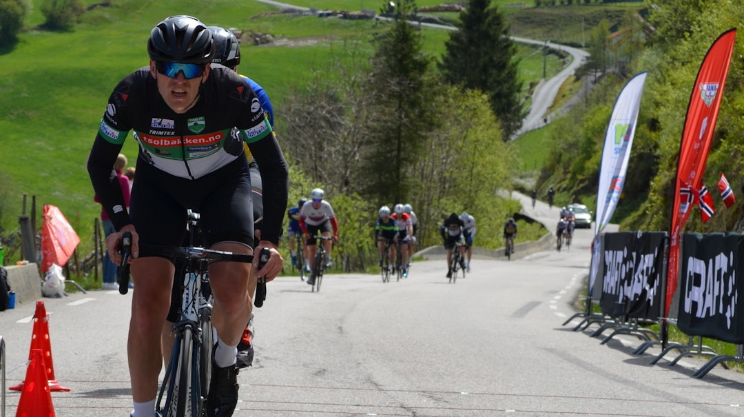 Starten går, og det kjøres relativt pent inn mot den ene skikkelige bakken. Bakken er ikke lang, men jeg kjenner at det kommer til å gjøre vondt med syv ganger opp her. Feltet er samlet etter første runde, og ut på andre runde legger jeg meg i front ned utforkjøringen. Jeg ender med å ligge i dødens posisjon og taue feltet litt for lenge og litt for hardt for meg. I det jeg er i ferd med å slukne går Fredrik Olsen i ett av sine utallige sigebrudd, Svein Ivar Reiso er oppmerksom og er raskt på bakhjulet, og får også følge av Øystein Blom-Ohlsen (Åsane CK). I tillegg støter George Corbin (Fana IL) seg opp til karene i front. Dermed er bruddet satt, og de holder like godt unna hele veien til mål.
