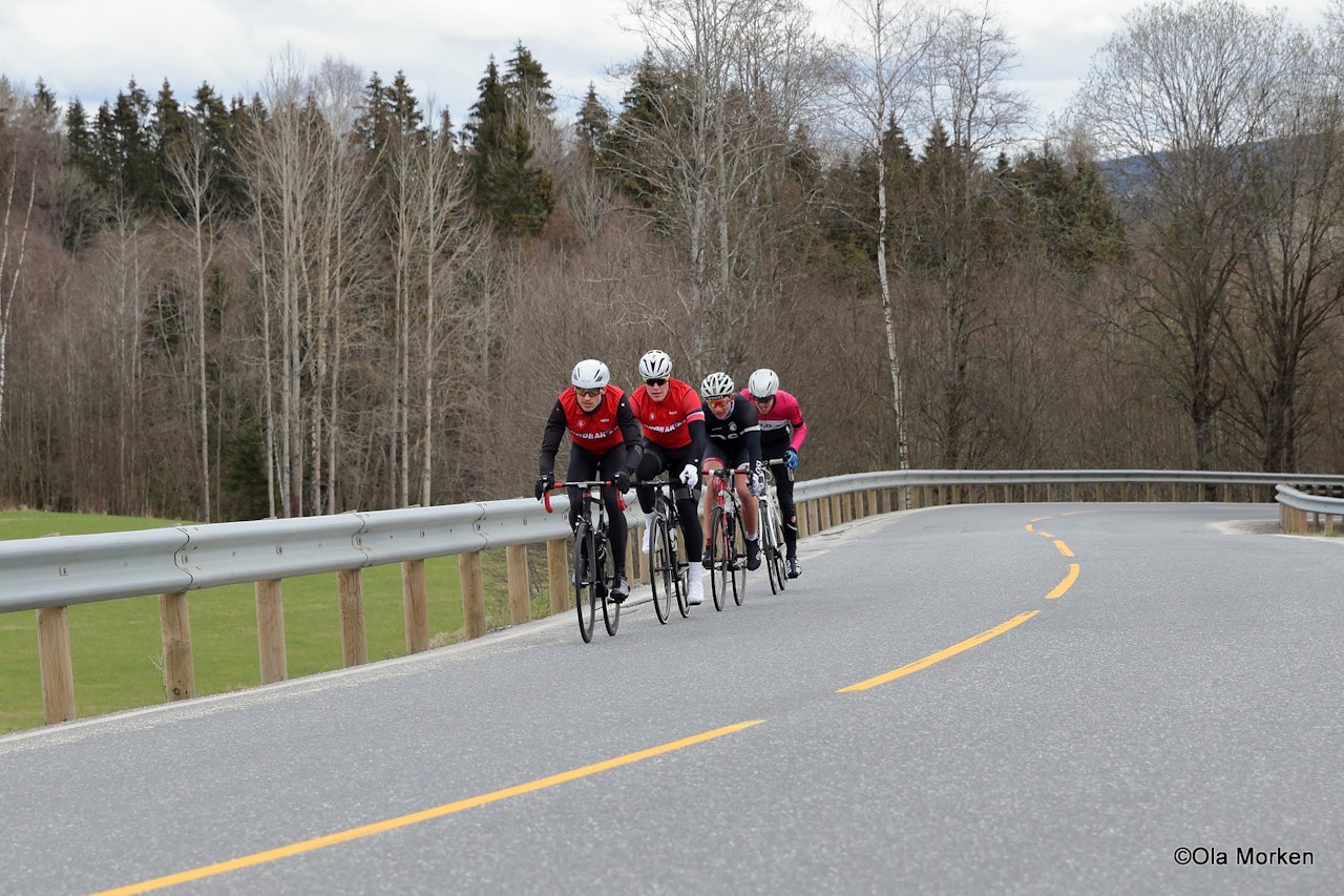 Ved cirka 25 kilometer har to karer fått et par hundre meters avstand, med tre til mellom dem og oss i hovedfeltet. Min ambisjon for dagen er ikke høyere enn å klokke flest mulig minutter over terskel, så jeg legger meg fremst og gir bånn gass. Neppe smart, men det er slik kjørestyrke bygges. Etter cirka syv minutter, med kokt hode og sprengte lunger, uten å ha tråkket inn én eneste meter legger jeg meg imidlertid bak for å hente meg inn igjen. Jeg er tydeligvis ikke Jens Voigt i dag heller.