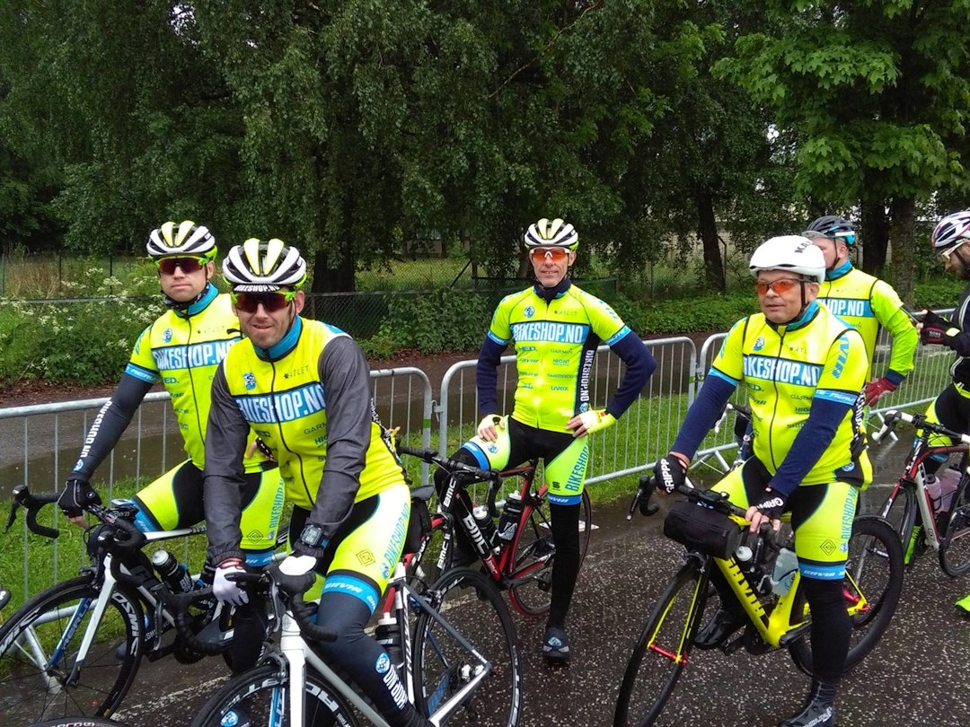 GULT ER KULT: I det som kan beskrives som kjipt vær var det i alle fall enkelt å se hvem som syklet for Bikeshop. (Foto: Margareth Steen.)