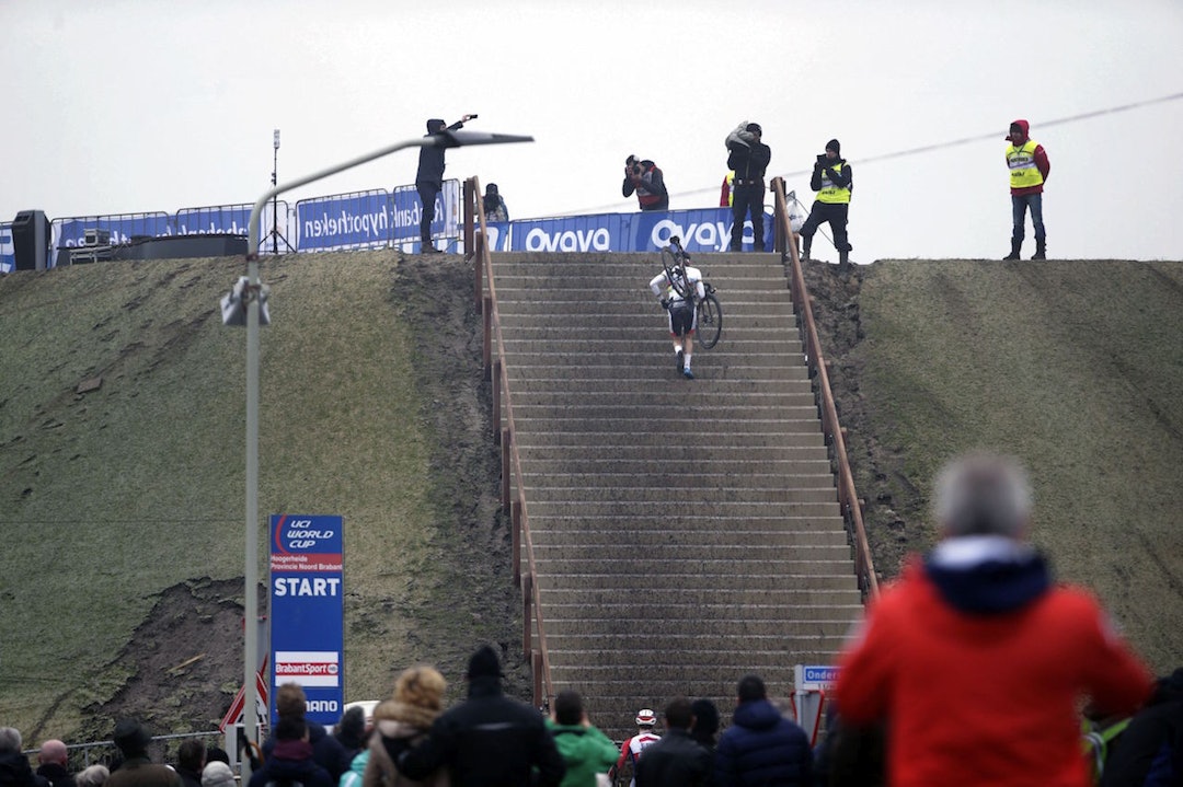 STIGESPILL: Fem runder, fem ganger opp trappen. Et beinhardt element i en ellers gjørmete løype. Foto: Cor Vos.