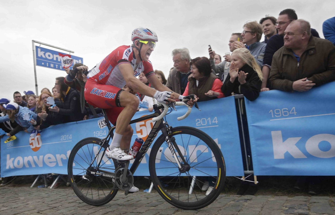 MAGADRAG: Alexander Kristoff på vei opp Koppenberg i Flandern rundt 2014.