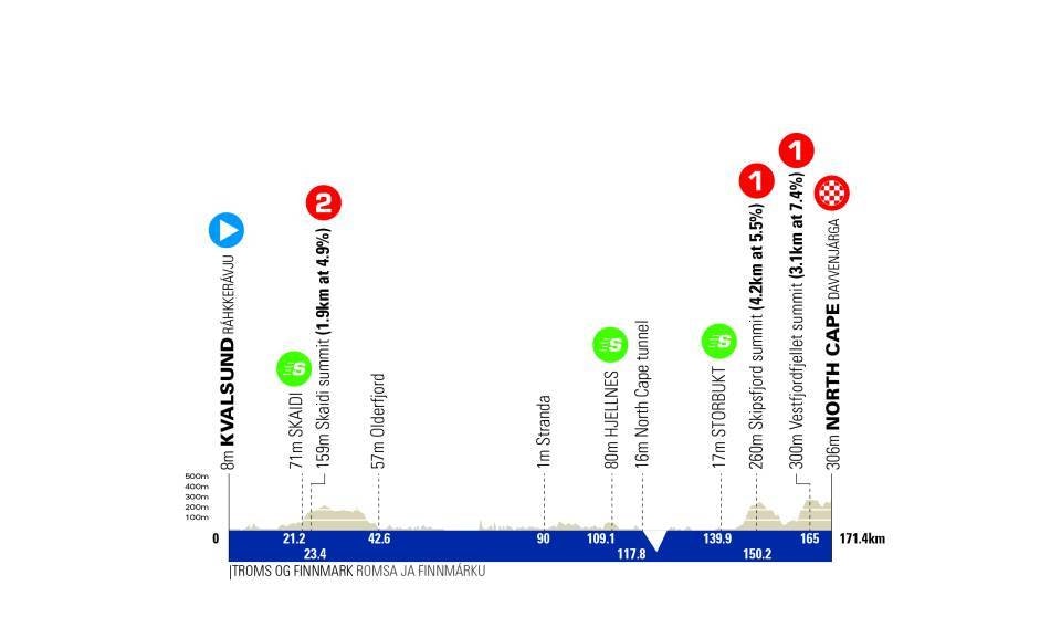 Den avgjørende etappen går altså til Nordkapp, og der venter tre krevende bakker i avslutningen. Inne på de 25 siste kilometerne skal en først over Skipsfjord (4,2 kilometer à 5,5 prosent) og Vestfjordfjellet (3,1 kilometer à 7,4 prosent), før det knekker opp igjen mot slutten, opp på Nordkapplatået.