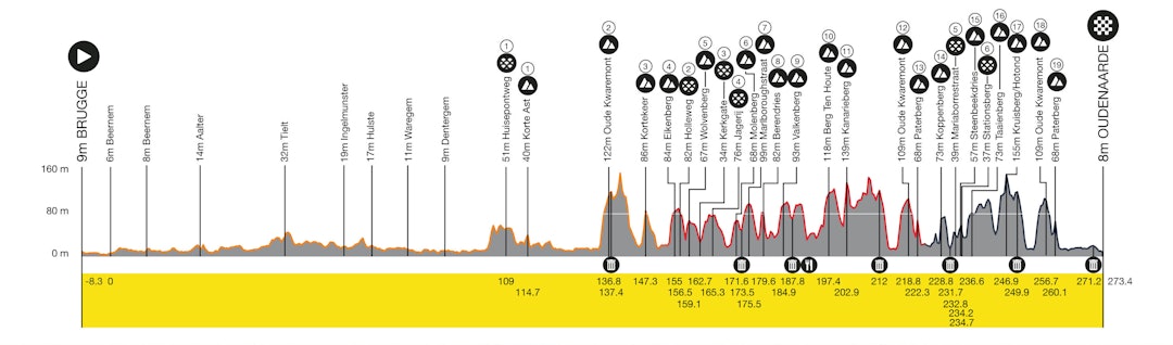 På veien fra Brugge til målgang i Oudenaarde skal rytterne forsere 19 bakker samt seks flate brosteinspartier.