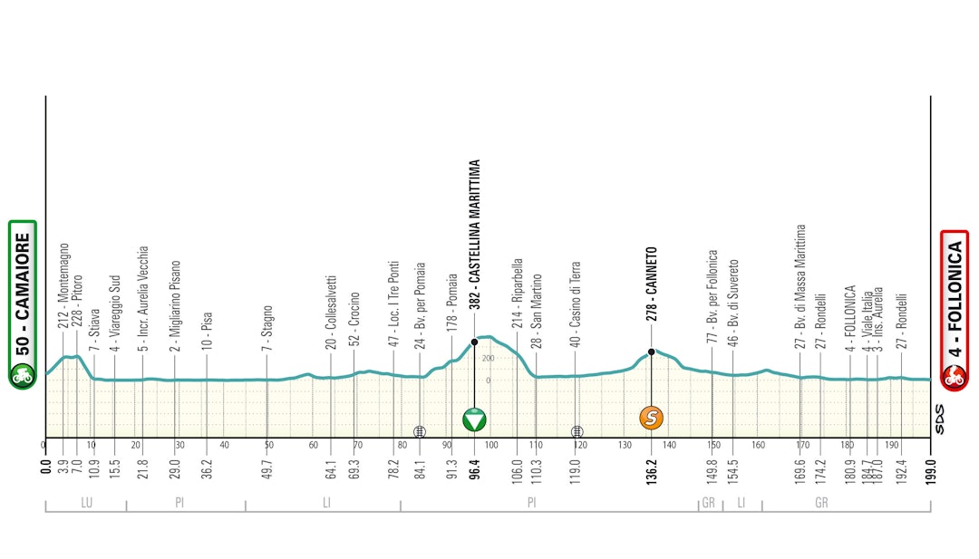 2. etappe, 5. mars: Camaiore - Follonica, 199 kilometer