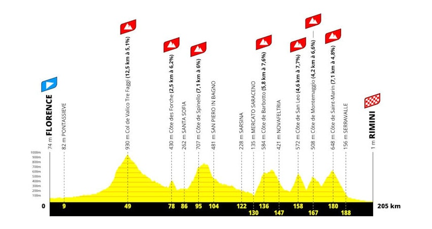 I 2024-utgaven i Italia er det lagt opp til en knallhard start på de tre ukene. Den første etappen inneholder hele 3 700 høydemeter med klatring på de 205 kilometerne mellom Firenze og Rimini.
