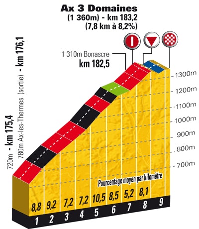 Stigningen opp til Ax-3 Domaines er i underkant av åtte kilometer lang og har en gjennomsnittlig stigning på 8,2 %. Mesteparten av stigningen går over 10 % i stigning og på noen småpartier er stigningsprosenten nesten oppe i 12 %. Ax-3 Domaines vil vise seg å være en svært viktig bakke i årets Tour de France, ettersom etappen har målgang på toppen av stigningen.