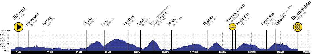 Brumunddal har forøvrig vært vertskap for rittets start ved to anledninger tidligere, men skal nå ta i mot rytterne for første gang. Også her blir det to avsluttende runder. Målområdet er tett på sentrum i Brumunddal, og vi vil få en finale med de store spurterne i sentrum. En svært rask siste kilometer i byen.