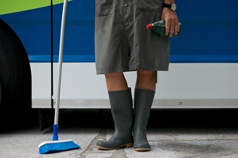 Laget var nettopp ferdig med siste test av temposykler før lørdagens kamp mot klokka, og mekanikerne fikk tiden til å gå med både vask, liming av dekk, girjustering og annet småtteri. Legg forresten merke til lagets altmuligmann, som kanskje bryter inn en ny trend: Lagerfrakk, gummistøver, sykkelcaps og ingenting annet!