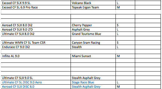 De tar også med tre utgaver av allroundmodellen Ultimate, en Ultimate WMN, eventyrsykkelen Endurace, en skivebremsmodell av Ultimate samt krossykkelen Inflite.