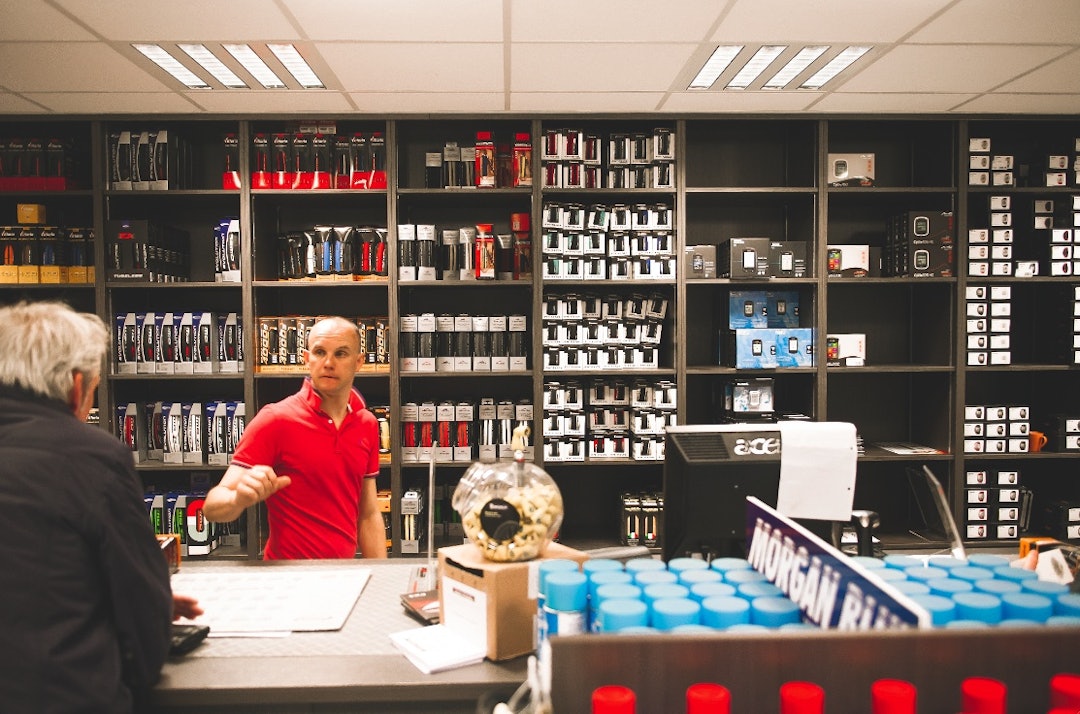 Olivier Vandenhende er langt fra stødig i engelsk, men er skråsikker når han skal beskrive hvordan det føles å sykle Paris-Roubaix i regnvær. Underveis i stotrende engelsk gir han en kunde et solid svar om to dekktyper. Jeg skjønner ikke et ord, men forstår at det er høyt kunnskapsnivå i belgiske sykkelbutikker.