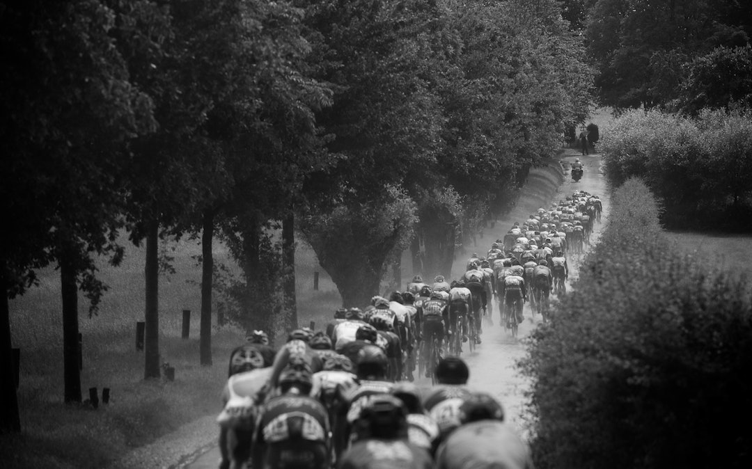 Når tv- bruddet går hører vi bakskiftere og kassetter som rister av seg tunge dråper, når feltet jager hører vi karbonfelger uten bremse-evne og lyden av sykler som sklir bortover asfalten. Helikopterlydene er nesten borte, og fra de stasjonære kameraene hører vi det blafrer i moderne regnjakker.