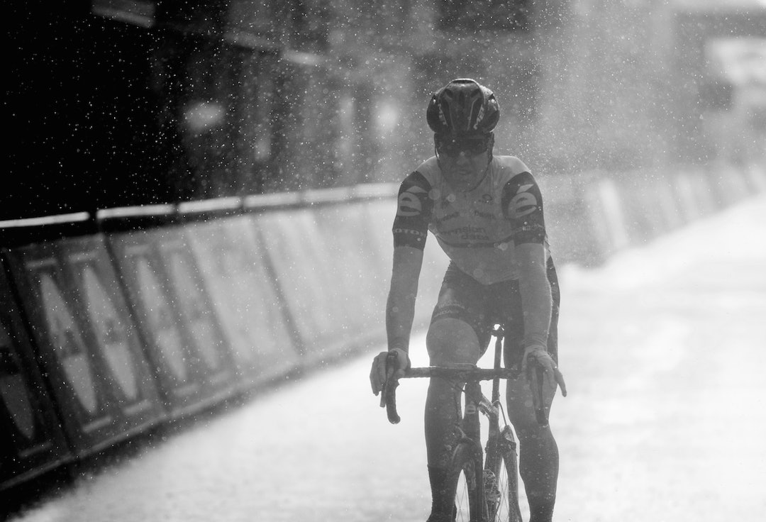 Mens vi venter på syklistene - runde etter runde, vil vi høre vannet sluke rittet, det vil ta et våttt, kaldt grep på asfalt, deltagere og tilskuere.