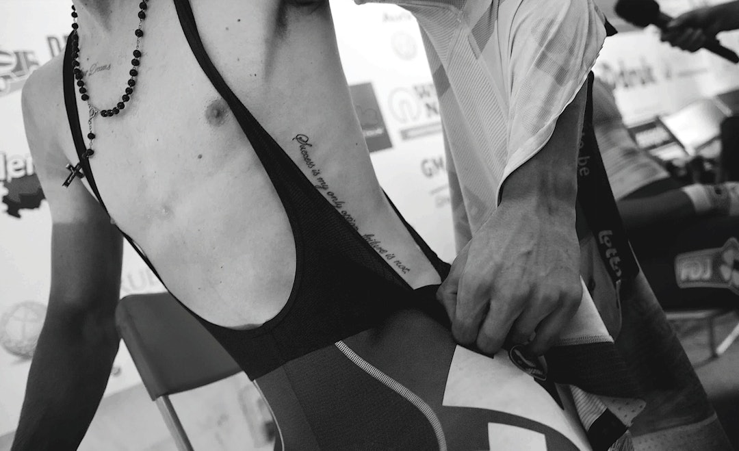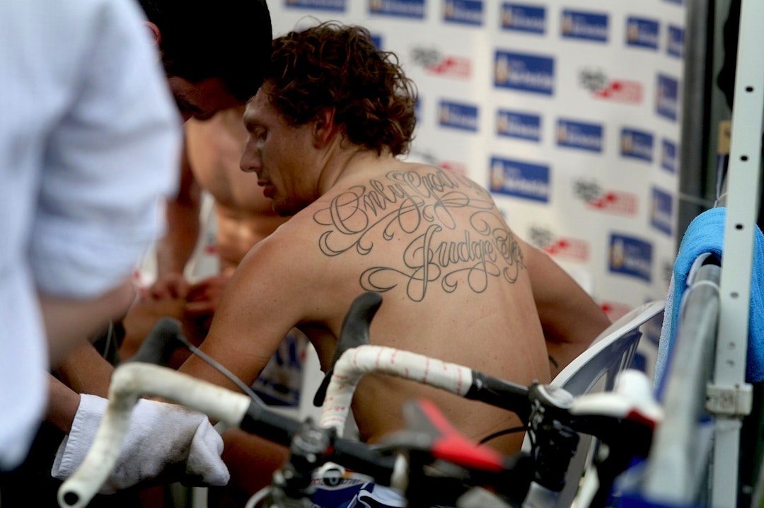 Italienske Filippo Pozzato er i sykkelsporten både sleip, arrogant, selvutnevnt stilikon og åleglatt snikdoper. I Italia er han sexsymbol med selvtillit helt opp til St. Peter. På ryggen har han siden bildet ble tatt fullført sin 2Pac-inspirerte «Only god can judge me now» tatovering. Ellers har han en malle på mage og rygg, i tillegg til tall fra eldre tider på begge armene. Ettersom resultatene har uteblitt, har han i stedet kompensert med enda flere tatoveringer.