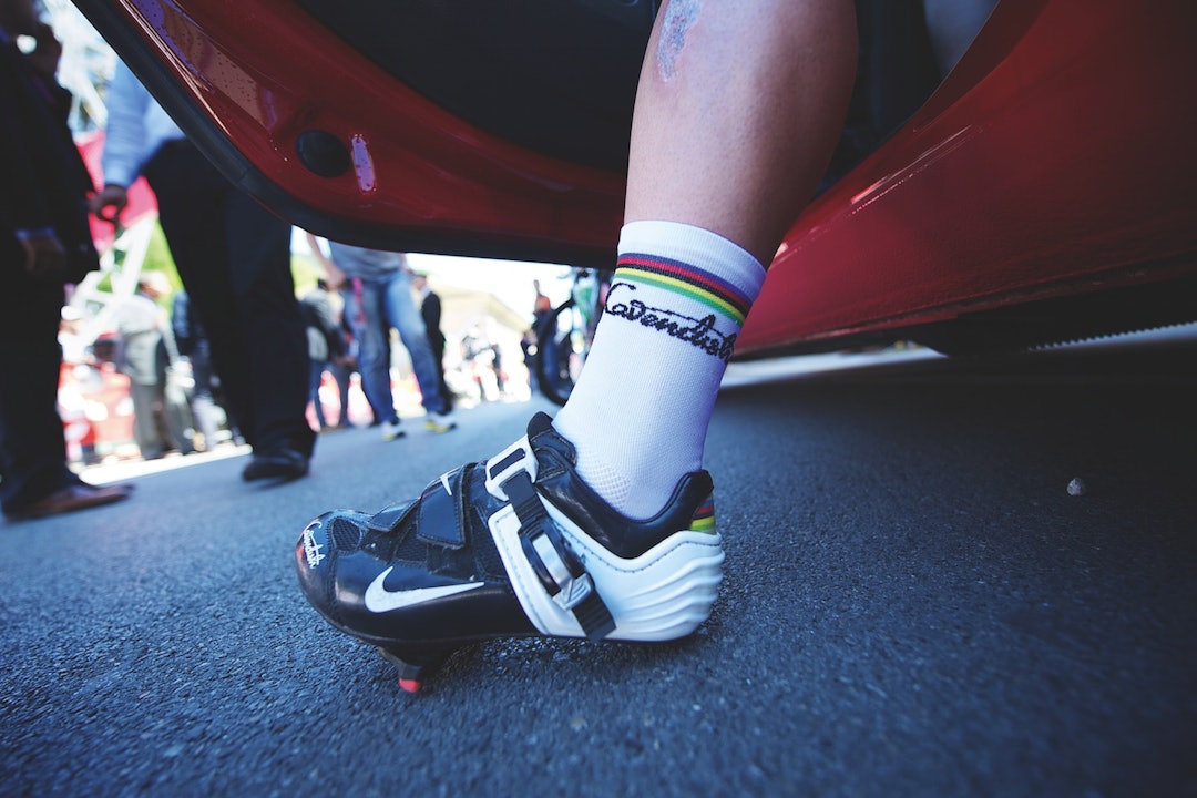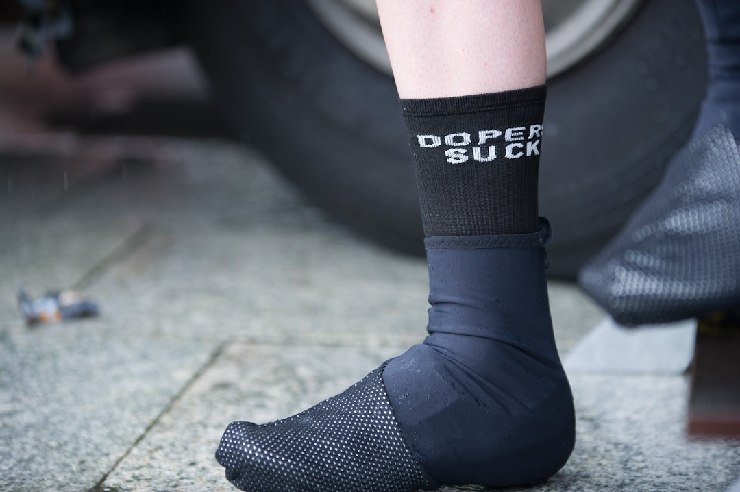 Da det stormet som verst beholdt Boonen både roen og stilen, særlig nederst på bena. Hans personlige twist på alle sokkemerkers mor Defeet, inneholdende både rettskafne verdensmesterstriper og en barnsligtøff Transformerslogo, er simpelthen dødskult.