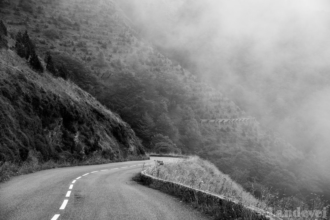 Skyer som trykker mer og mer. Lenger oppe blir veien slukt av tåken, brått kan vi ikke se noe som helst. Tåken demper all støy, men vi hører så vidt en kubjelle langt unna. El- ler ikke. Sekunder senere står den midt i veien og lurer på det samme som oss.
