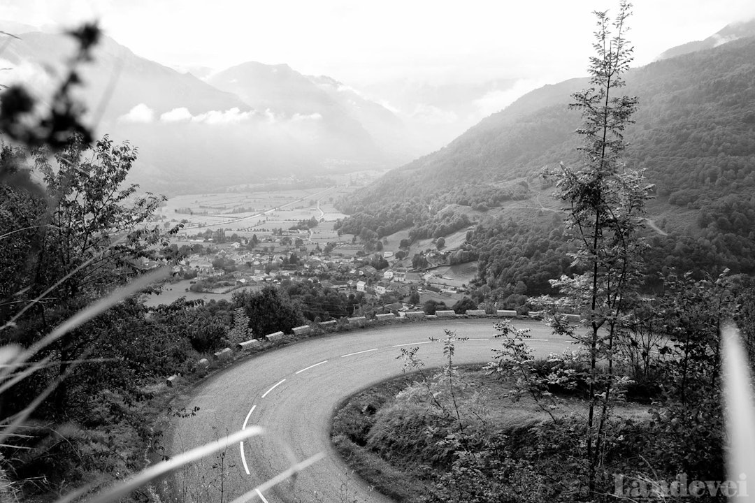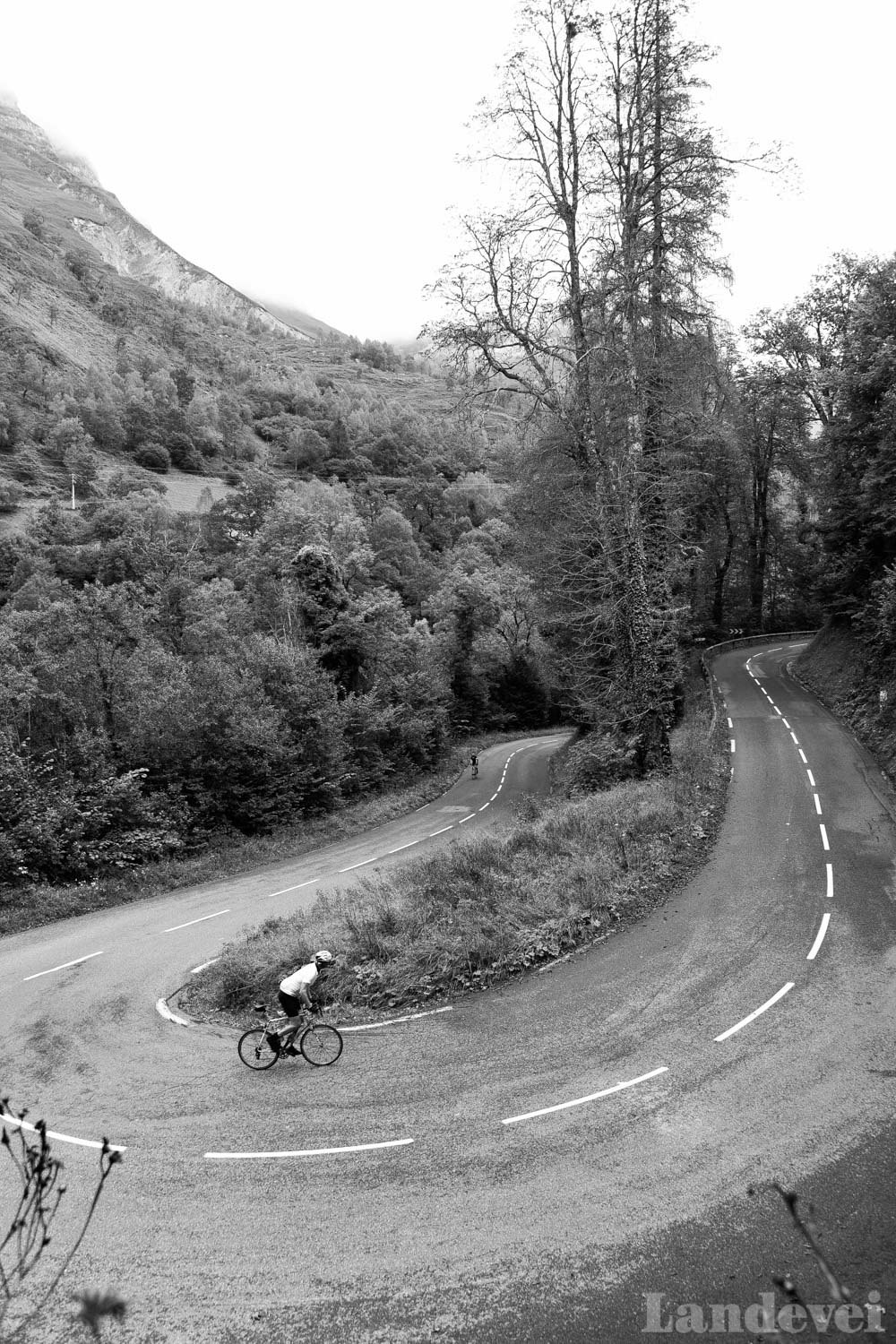 Col du Aubisque er neste bakke, det er bakken der du finner tre enorme sykler på toppen. Asfalten er fin og bred, det er mye større moment som leder oss opp mot toppen. En og annen fugl sirkler over oss på jakt etter bytte. Det er kraftige striper på begge sider av veien og i midten. Meter for meter med hardt og ærlig arbeid.
