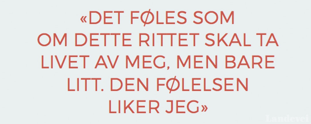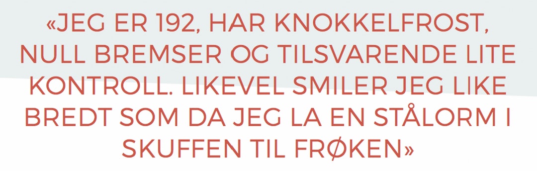 «Jeg kommer til å huske denne nedkjøringen. Jeg har ingen bremser, og det er ganske bratt. Det er masse snø på felgbanen, og jeg har slitt ut et sett med bremseklosser. Men dagen gir stor mestringsfølelse, jeg tror det er det samme folk opplever på Norseman eller andre krevende ritt. Når jeg kommer til mål er jeg våt og kald, men det er et stort telt der med masse mat. Alle rytterne der er glade. Jeg har ikke fryst underveis, det er så høy intensitet at en glemmer kulden. Det var et hat mens det pågikk, men nå lager jeg gode minner».