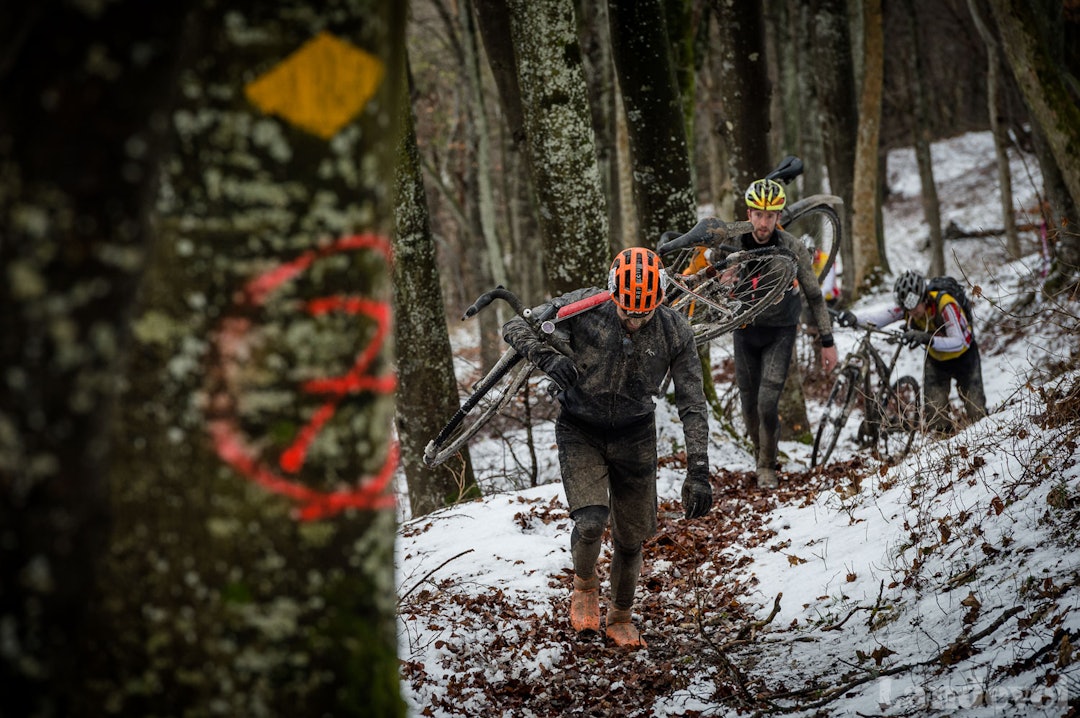 Jeg kaster sykkelen på skulderen og løper i tretti centimeter våt nysnø. Det føles som å løpe med bajonett på munningen, med en krigsjournalist og follow-cam bak. Jeg er langt over terskel og det går ikke fortere enn fem kilometer i timen, ennå er det langt til jordet er slutt. Jeg klarer akkurat å løpe opp til de andre, til dagens kompani.