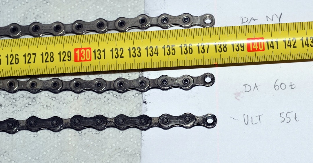 Helt nytt var kjedene 138 cm lange. Da vi la de to brukte kjedene og et nytt kjede ved siden av hverandre, måtte jeg fram med målebånd og laser for å faktisk se om det var forskjell – og så vidt jeg kunne måle, hadde begge kjedene strukket seg 0,1 cm hver – det vil si at både Ultegra- og Dura Ace-kjedet målte 138,1 cm etter bruk. Dette utgjør et strekk på 0,07%, altså ikke engang én promille.