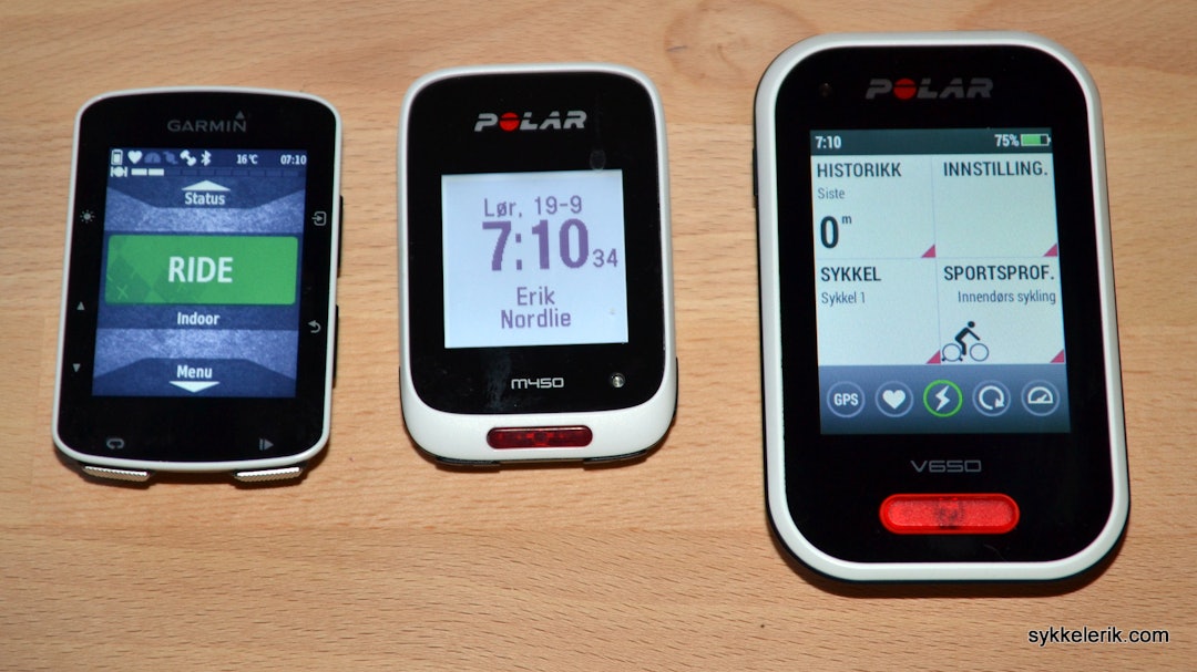 STORLEIK: Garmin Edge 520, Polar M450 og Polar V650 sett ovenfra.