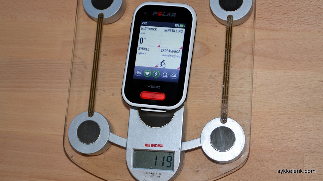 V650 er cirka 6,5 x 10,5 x 1,5 cm og veier 119 gram, hvilket gjør den sammenliknbar med Garmin Edge 810 i størrelse og vekt.