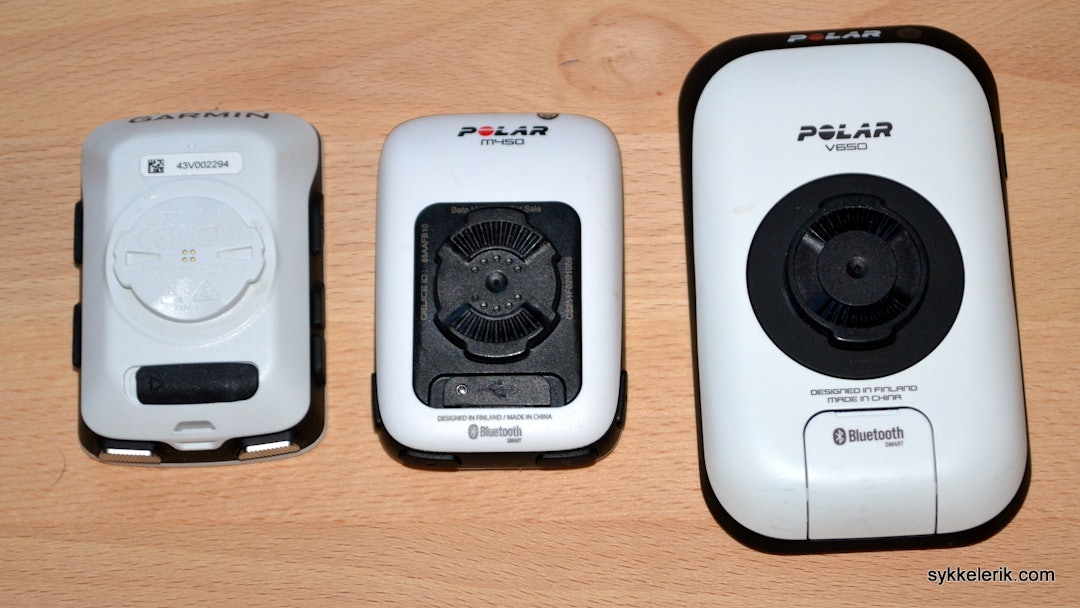 PÅ PLASS: Garmin Edge 510, Polar M450 og Polar V650 sett fra undersiden. Polar og Garmins festemekanismer er ulike.