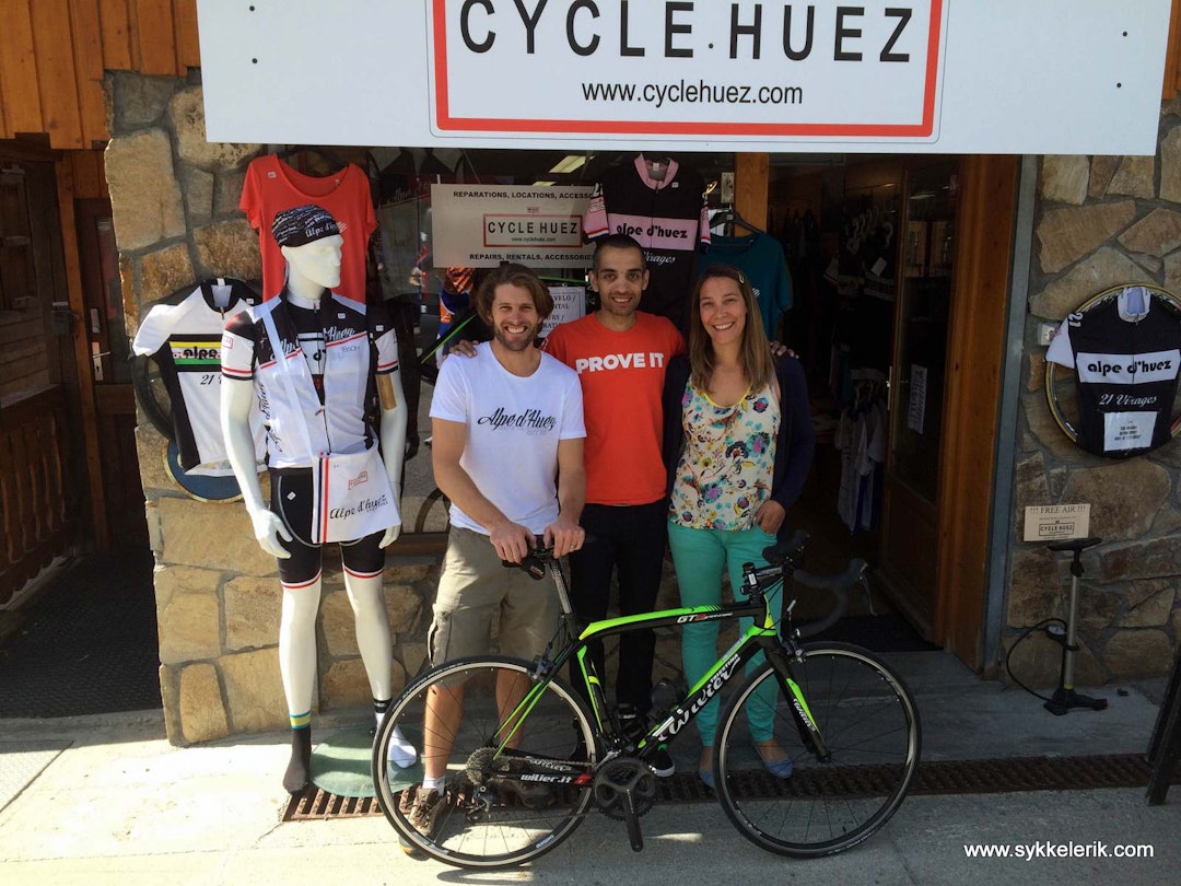 KUNDESERVICE: Oli, meg og Kat med en lekker Wilier utenfor utleiebutikken deres, Cycle Huez, på toppen av Alpe d’Huez. Jovial og god engelsk-australsk service – anbefales dersom du skal til området og trenger en sykkel!