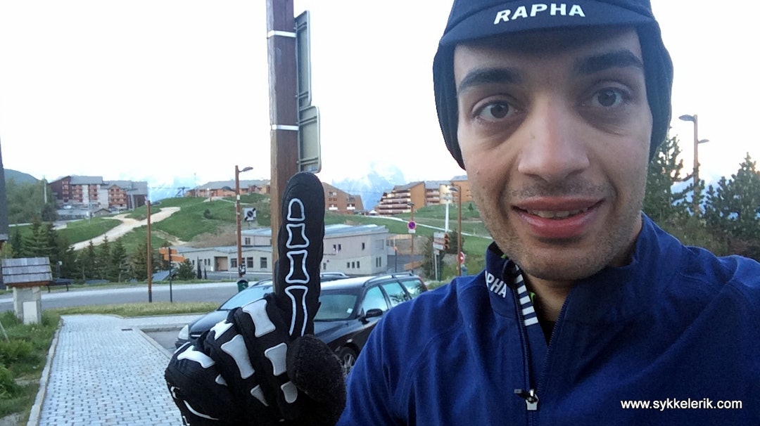 Erik og jeg bestemmer oss for å kjøre i eget tempo, så allerede fra første sving er vi hver for oss. Det er meget spesielt å sykle verdens kanskje mest kjente fjell i tussmørket, helt alene, uten en eneste lyd annet enn sin egen pust, dekkene som triller og girene som glir oppover mot letteste utveksling. Det er iskaldt, men det går også veldig lett og jeg må holde igjen for å ikke gå over 225 watt. Jeg legger merke til at det lukter av husdyr i det jeg kommer ut av hver landsby, og lurer på om kyrne i Alpe d’Huez sover inne sammen med bøndene. Etter hvert som jeg tråkker gjennom landsbyene La Garde, Le Ribot og Huez begynner sola å stige, og fuglene begynner å våkne. Ingen biler eller andre syklister å se. Beina er uforskammet fine, og det hjelper godt på kropp og sjel at morgenen kommer. Når jeg skifter flasker på hotellet tenker jeg at dette er jo kjempelett og dette kunne jeg gjort til evig tid!
