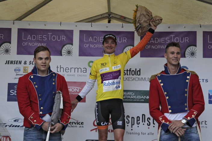PODIEMENN: Marianne Vos i den gule ledertrøyen, omkranset av lokale podiegutter. Foto: Anton Vos.
